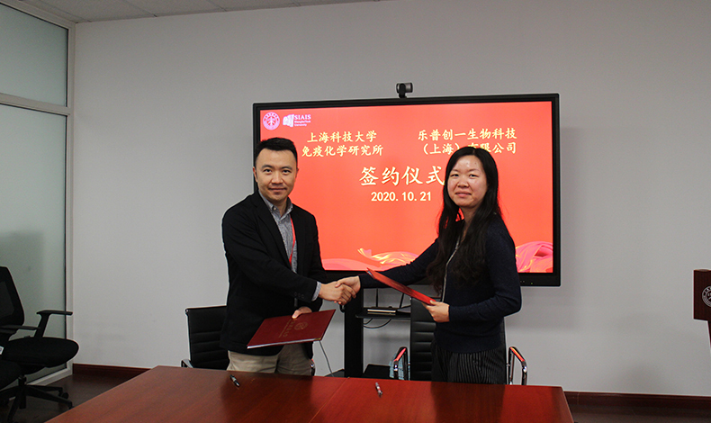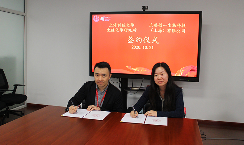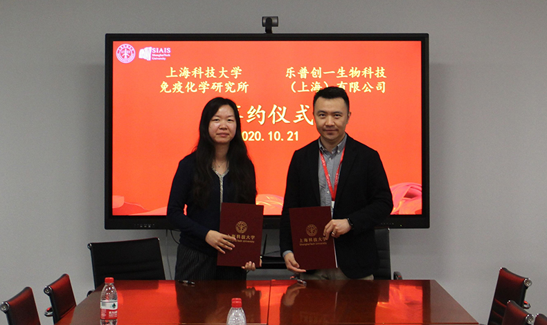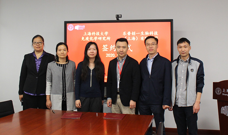 2020年10月21日,上??萍即髮W免疫化學研究所與樂普創(chuàng)一生物科技(上海)有限公司舉行科研合作簽約儀式。上??萍即髮W免疫化學研究所助理所長、高通量篩選平臺主任雷穎,上??萍即髮W免疫化學研究所高通量篩選平臺工程師孔娟,上??萍即髮W免疫化學研究所高通量篩選平臺工程師姜連連,樂普創(chuàng)一生物科技(上海)有限公司總經理方磊,樂普創(chuàng)一生物科技(上海)有限公司抗體平臺主任曲志虎,樂普創(chuàng)一生物科技(上海)有限公司科學家王旭輝等出席簽約儀式。
